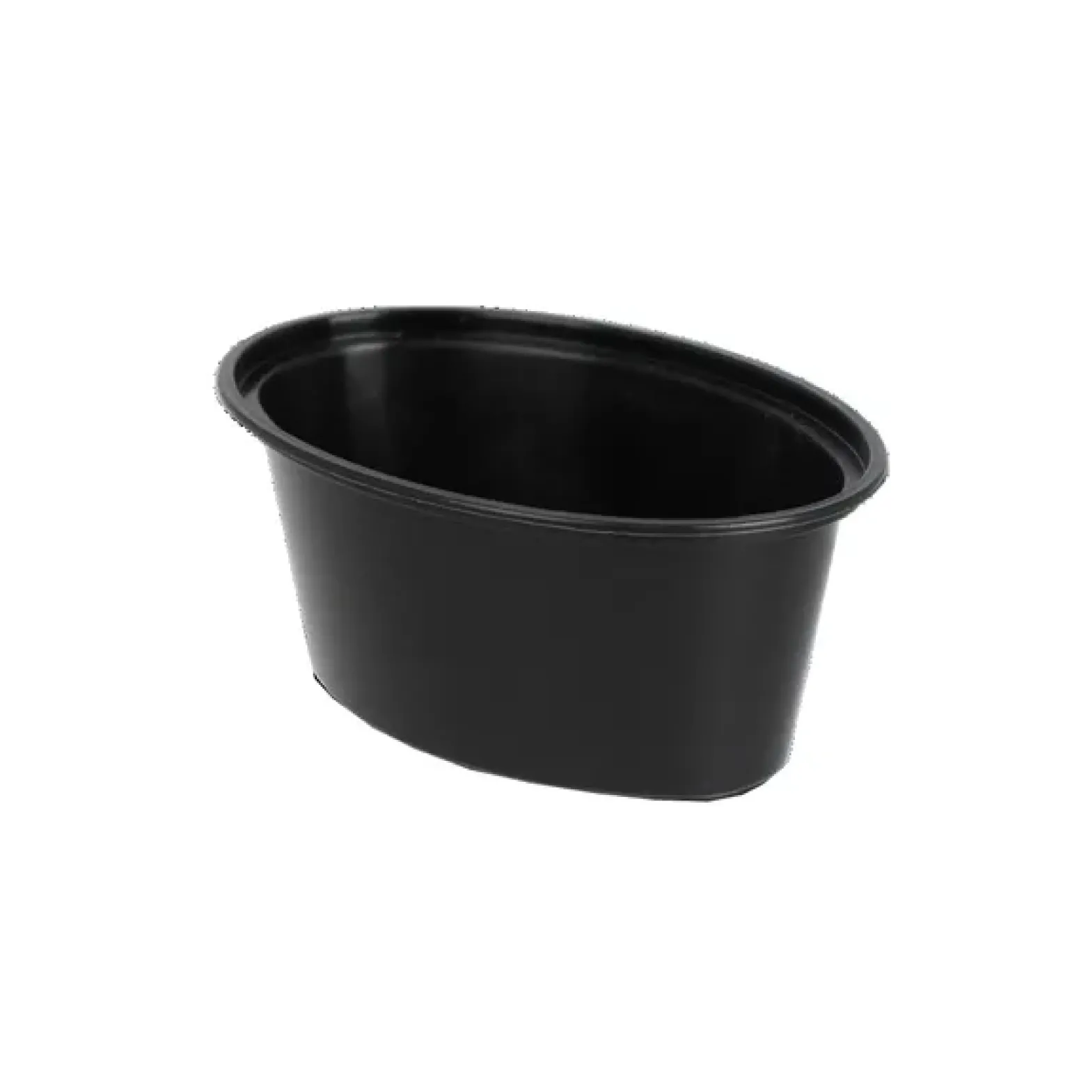 Deze ovale saus cup heeft een inhoud van 75 ml, wat hem perfect maakt voor middelporties saus of dressing. Het bakje is zwart en gemaakt van stevig plastic (PP). Het bakje is daarnaast 3,7 cm hoog en heeft een diameter van 88 mm.