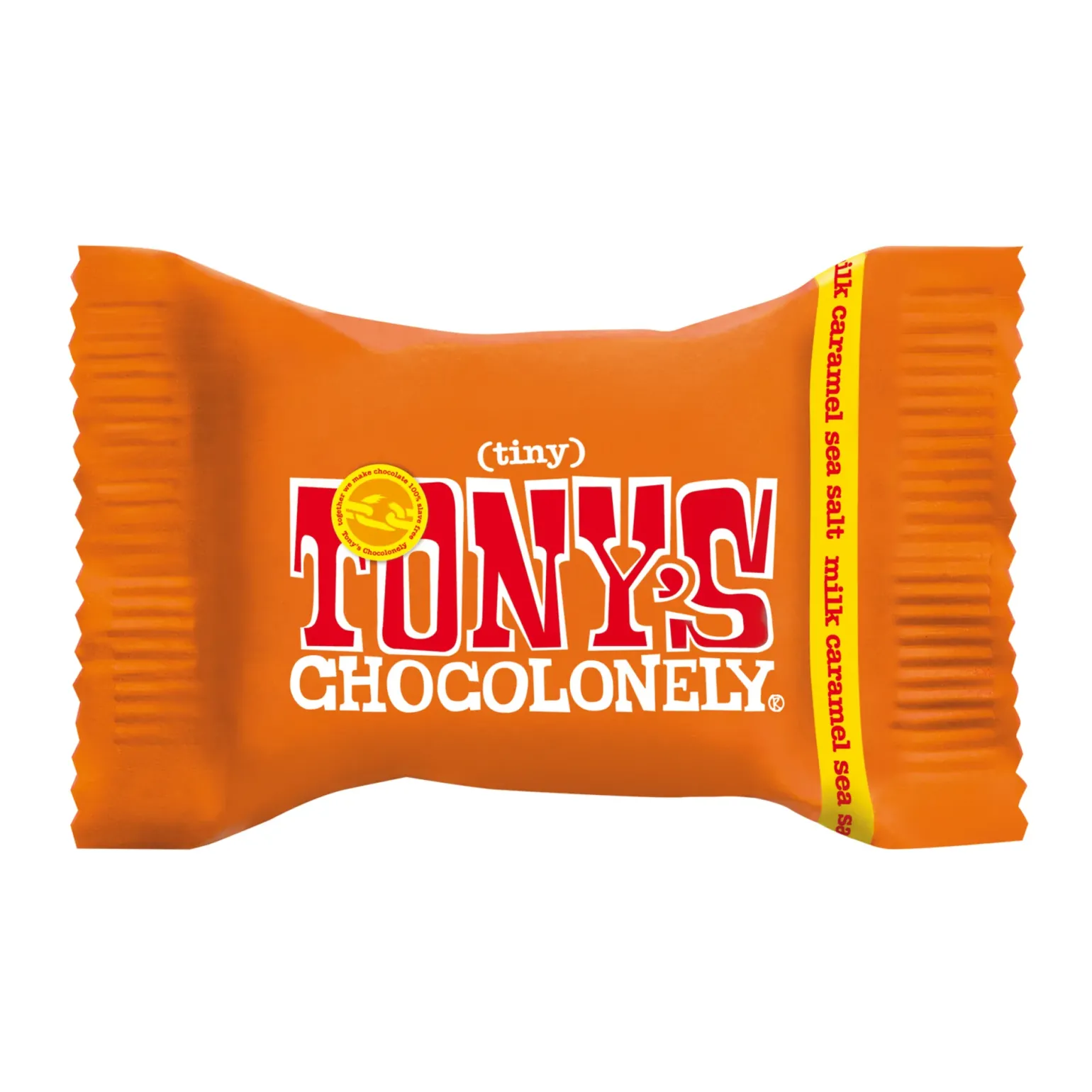 Tiny Tony’s karamel zeezout zijn individueel verpakte Belgische Fairtrade melkchocolade met stukjes karamel en zeezout. Klein maar fijn en heerlijk bij…alles! Als snoepje bij de koffie, thee of chocolademelk. Om uit te delen als traktatie. Om in jouw wachtruimte of lobby te zetten. Bij de kassa in jouw restaurant, café, kapsalon of nagelstudio. Iedereen wordt blij van Tiny Tony’s caramel zeezout. Wacht je op een Tiny Tony’s aanbieding? Niet nodig: bij online snoepgroothandel Compliment.nl zijn Tiny Tony’s caramel zeezout altijd voordelig! Je koopt Tiny Tony’s caramel zeezout per uitdeeldoos van 900 gram (100 chocolaatjes). Wij verkopen ook de of