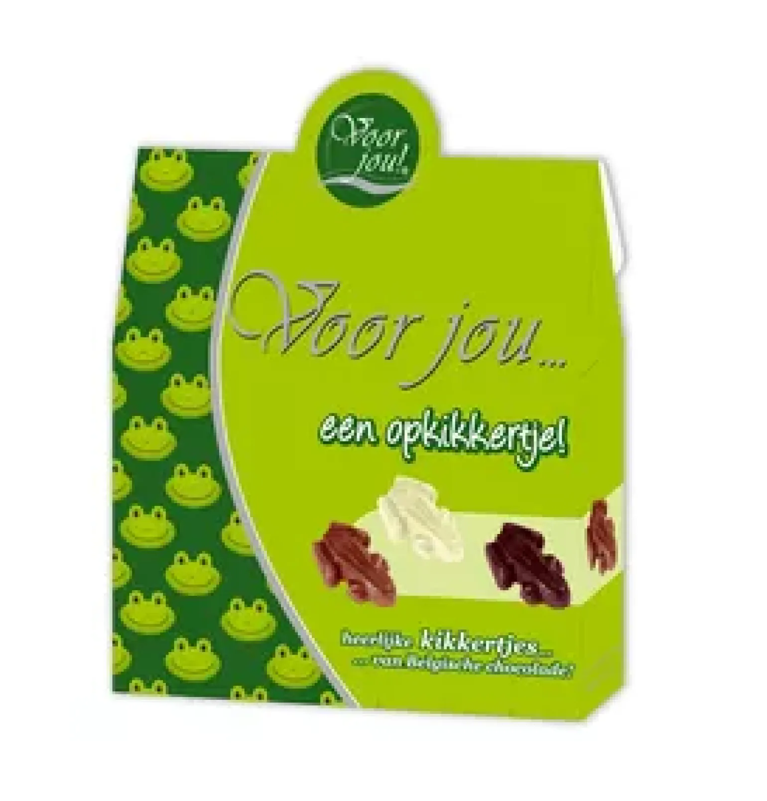 Dit opkikkertje zal zeker bijdragen aan herstel. Heerlijke chocolade kikkertjes voor iemand die écht eventjes een hart onder de riem nodig heeft. Er zitten 6 doosjes à 100 gram in een doos.